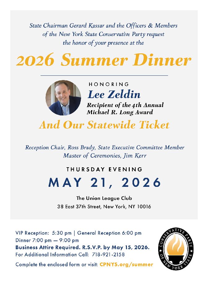 Summer Dinner Honoring Lee Zeldin I’m excited to invite you to join me and the Party at the New York State Conservative…